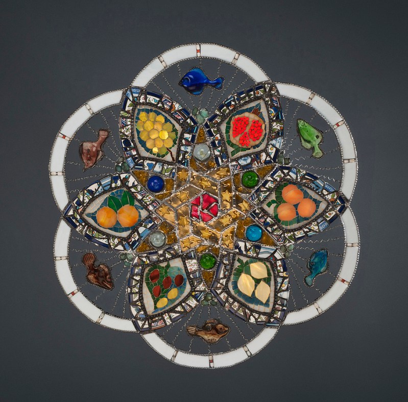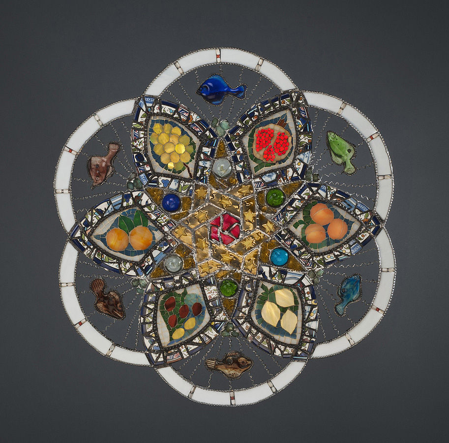The geometric design is a variation of the traditional seven-circles Islamic design and forms a continuous line. The brass pieces with star cutouts and glass cabochons are from a lamp made in Hebron that I purchased in Jerusalem’s old city. Many of the pottery pieces were plates made by the Natsheh family, one of Hebron’s historic glassblowers who also cast the glass fish. The aqua glass pieces were collected along the Mediterranean beach and are probably slag glass from ancient factories along the coast. Hebron hosted, in August 2011, an exhibition of antique Palestinian mosaics that included a wall with broad leaves filled with fruits, simplified for this artwork and representing hopes for an abundant future for the Abrahamic family.