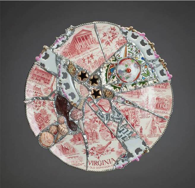 Virginia state plate; Japanese teapot lid; shells; Mexican jewelry; Middle East pottery; brass stars from a Hebron lamp; fish cast in Hebron.